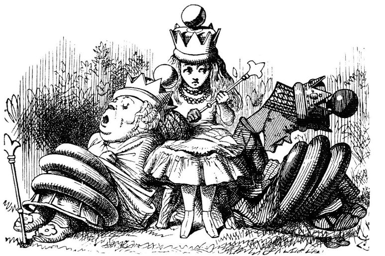 The seventh chapter of each work is about quality, with the Tea Party and the Lion & Unicorn, and the Mad Hatter and Hare appear in both. The eighth chapter is about quantity, with the playing cards of the Queen of Hearts and inventions of the White Knight. The remaining chapters of each work are about substance, with the insubstantial lies of the Mock Turtle leading to the King of Heart’s Trial over tarts, and the test about sums leading to the Queens’ Banquet.