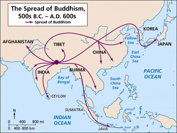 Scholars debated whether it arrived first by land over the silk road in Western China or by sea in Southern China, spreading upriver, but today it is thought that Indian Buddhist evangelicals, missionaries, monks and nuns first arrived by the Silk Road, and then took both routes over the next several centuries.