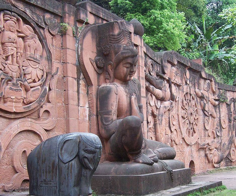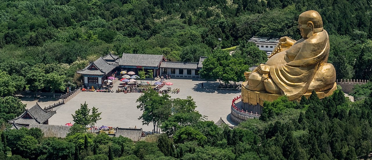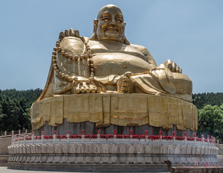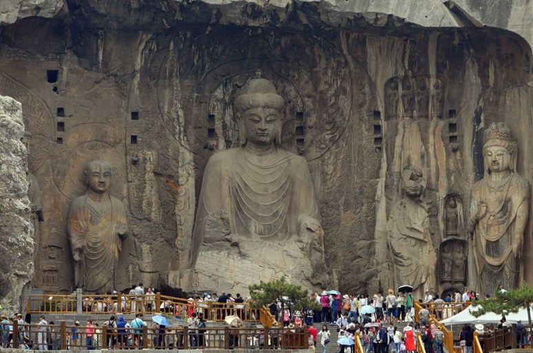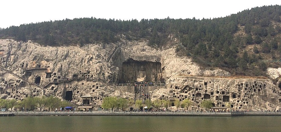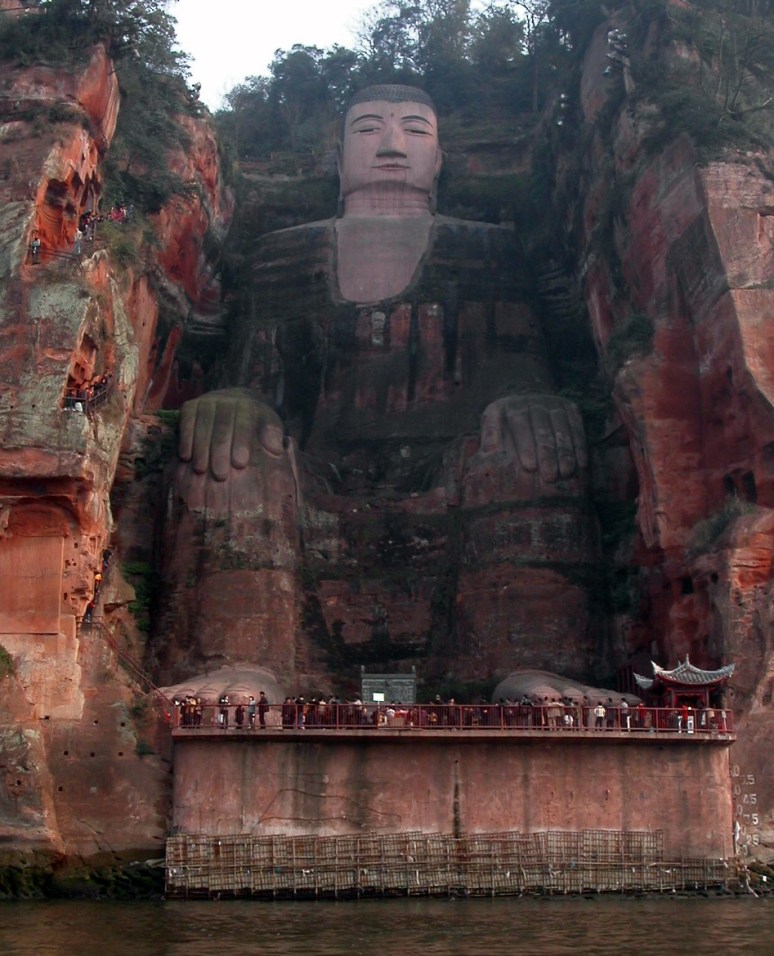 The Longmen Dragon’s Gate Grottoes, with over 100,000 statues, were also extended and completed in the Tang with court support of Emperor Gaozong and Empress Wu. The large, central statue of the Buddha is said to resemble Empress Wu herself, and that she donated 20,000 strings of coins set aside for her cosmetics budget to complete it. Similar great works of Tang statuary are found in the Yungang Grottoes and the gigantic Buddha at Leshan, over 70 meters tall and carved between 713 and 803 CE out of red sandstone to calm the waters where trading ships pass through, and because the removed rock was thrown into the river, the current was calmed, which may have been the plan all the while or led to the legend afterwards.