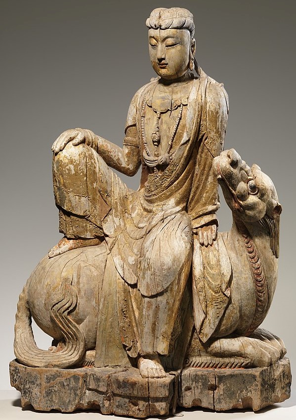 Manjushri tells the story of Longnu, the daughter of the naga (snake-god) king in the original Indian version, who in China is called a dragon princess. After hearing the Buddha’s teachings and becoming enlightened, she goes to have her enlightenment confirmed by the Buddha’s followers, but they tell her that she cannot be, so she goes to the highest heaven realm and gives the Buddha a pearl in thanks. This story shows that even women and snake-dragons can be as enlightened as male humans, part of the egalitarianism of the Mahayana teachings.