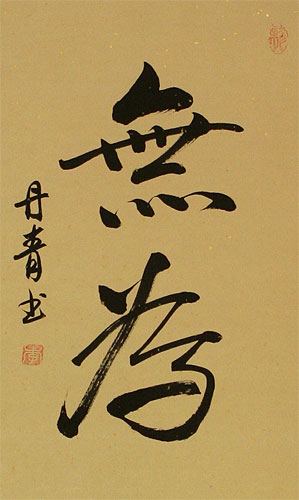 Confucius said the central thread throughout his thinking, the one underlying idea that ties all his thinking together, is compassion, being humane to be a better human. The central thread throughout the thinking of Laozi, Zhuangzi and other Daoist masters is doing more with less, what the Daoists call non-action, wu-wei in Chinese (and in Chinese calligraphy here to the left). Daoists think you can think by barely thinking, feel by barely feeling, eat by barely eating, talk by barely talking, sleep by barely sleeping, and interact with others by barely interacting. If we simplify and calm the mind, heart, stomach and senses, we think, speak, care and feel less, but also think, speak, care and feel clearly and easily, so we can do much more with much less with great ease.