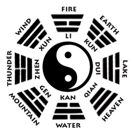 The system is built out of eight trigrams which in pairs of upper and lower trigram form sixty four hexagrams. Each trigram is build out of solid and/or broken lines, solid signifying yang and broken signifying yin. In ancient times, a question was asked and sticks were tossed to determine each line, starting from the top down. The counter-culture of the fifties, sixties, seventies and eighties, including surfers (who were introduced to Daoism in Hawaii), beatniks, hippies, and new age spiritual seekers, would toss coins, often quarters, heads being yang, and tails being yin. Six tosses equals six lines, giving two trigrams, one heaven and one earth. The trigrams are: