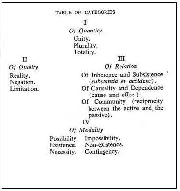 Unfortunately for Kant, many later found Kant’s table of twelve to be much like Aristotle’s list of ten, in that Kant does not show how he systematically derives the twelve, and many of them seem to overlap with each other, such that, like his own criticism of Aristotle’s list, Kant’s table can be further analyzed and systematized. Later, Wittgenstein offered his truth tables to further the work of Frege, which served a very similar role, reducing the modes of thought to operations such as AND, OR, and IF/THEN. As a result, just as Aristotle’s ten categories was largely ignored after the scholastics, Kant’s table of categories was largely ignored by Neo-Kantians such as Frege as they continued to refine formal logic.