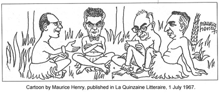Reacting against Existentialism, Sartre and his circle, Levi-Strauss was joined by Lacan, Foucault and Barthes as Structuralism rose to prominence in French thought. This was immortalized in a 1967 cartoon, The Structuralists’ Lunch Party, which showed the four philosophers sitting on the ground wearing grass skirts. The Structuralists, like the Existentialists, were pessimistic about modern society, but rather than escape culture via free individuality, they chose to understand culture and control by studying pre-modern people. As we turn to Barthes and then Foucault, we will be passing from Structuralism to Poststructuralism, which gave up on discovering universal patterns underlying all cultures but still considers the individual to be a construct of culture.