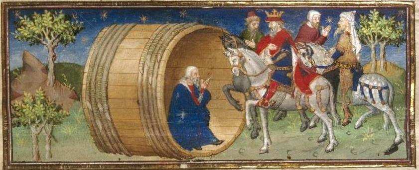 Diogenes was also said to have mocked Alexander the Great as he passed through Athens on his conquests, who was happy to have found the famous philosopher and offered to give him anything. Diogenes famously replied that Alexander could move so that he was no longer blocking his sunlight. This story contains a joke too, as Alexander had himself crowned a god and identified with the sun in Egypt, while Diogenes sees him as a hindrance to the sun. Alexander, impressed by Diogenes’ courage, said that, if he could not be Alexander, he would wish to be Diogenes. In another story, Alexander found Diogenes looking through a pile of bones, and when asked what he was doing Diogenes said that he was looking for Alexander’s father’s bones, but they seem no different than a slave’s. Alexander came from the North of Athens, and would have been considered a barbarian like Diogenes himself as well as Aristotle. It is likely these encounters never happened, but grew in later times after cynicism had become popular in lands formerly conquered by Alexander.