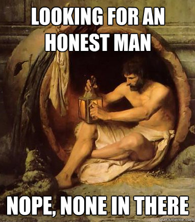 In one of the most famous stories, Diogenes carried a lamp in the daytime around Athens and said he was looking for an honest man, the joke of course being that one could not be found in plain sight during broad daylight. This is very similar to Socrates, who wandered Athens in search of someone who truly knew something but could find no one.