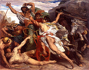 The mythology and history of ancient Greece, like that of other ancient cultures such as the Indians and the Mayans, was recorded in poetry and song. As mentioned last time, it was only with Alexander and his brief empire that the city states of ancient Greece were united as a single state, though they shared a common language and tradition for centuries before. The two largest ethnic groups were the Ionians (of the Turkish eastern half of ancient Greece) and the Dorians (of the western half, what is today the modern European nation of Greece). There was a genealogical myth shared by these and other groups of a King Helen who had three sons (Aiolos, Doros & Xouthos) whose descendants became the tribes of interrelated but distinct ancient Greeks. This is very similar to the Old Testament narrative of Noah, whose three sons repopulated the world after the great flood. Both stories explain the diversity of human ethnicities and cultures by way of a single family of origin.