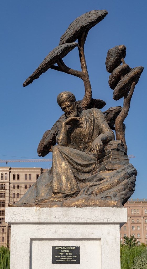 Avicenna was born in the village of Afshana in what is today Uzbekistan, his father the governor of a larger, nearby village they didn’t live in, which is an interesting strategy employed today in DC. As a boy Avicenna is said to have learned Indian Arithmetic from an Indian grocer in his neighborhood, read all the Greek philosophy he could find, boiled it down in his notes to the essential points and then rearranged the points into as coherent arguments as he could, producing vast commentaries on many subjects as needed, and he claims to have learned nothing after the age of 18, having read all the texts he could by then, and then maturing year by year as he thought over what he learned.