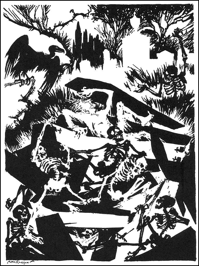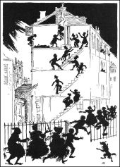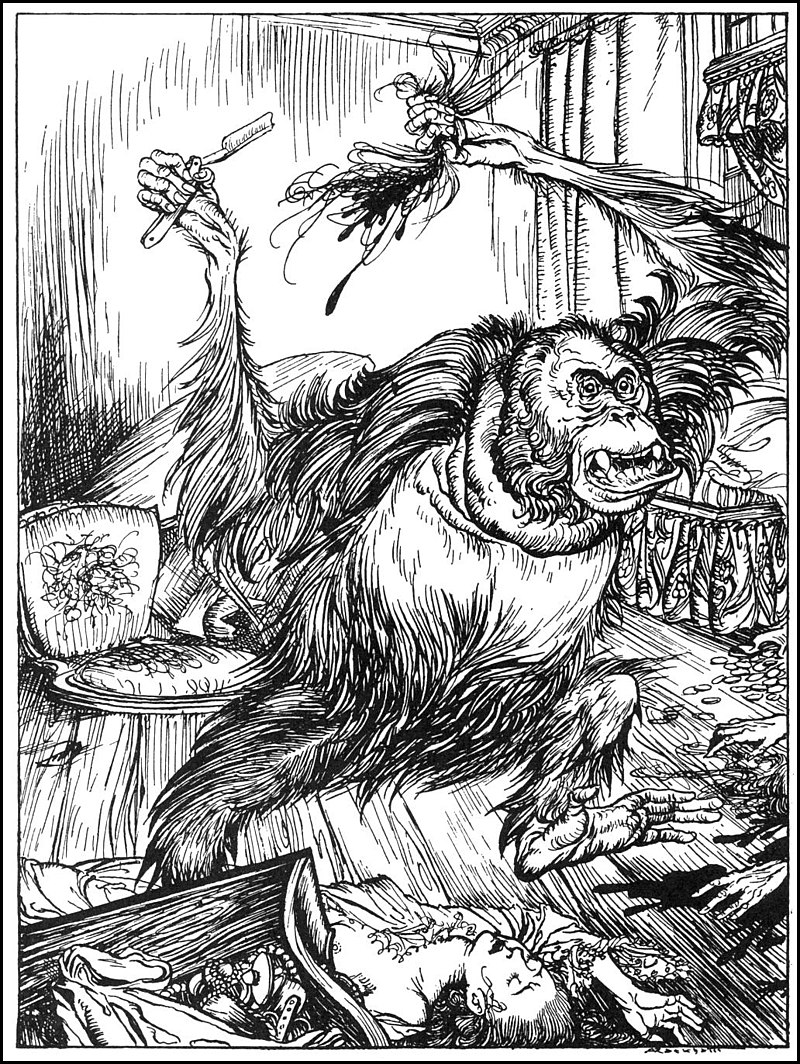 The ape tries to shave the mother to help her, but doesn’t know neither women nor apes shave. The mother screams and struggles, angers the ape, and with one sweep of its arm it severs her neck. The frenzied ape drops the razor on the chair, strangles the daughter, sees the sailor in the window, breaks the furniture, shoves the daughter up the chimney and the mother out the window to conceal its crimes in simple ways. The ape hurls the mother headlong through the window, which is barely possible as she barely has a head. The sailor slides down the lightning rod and goes home, abandoning the ape completely. The voices the crowd heard on the stairs were the sailor outside and the ape inside.
