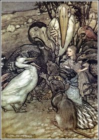 The Dodo suggests they dry themselves off with a meaningless political caucus race that goes round in circles with no clear winners, and Alice hands out a piece of candy to each bird. The large birds can’t taste it, and the small birds choke on it. The Mouse leaves offended, a mama crab tells her daughter that there is a lesson here: Never lose your temper. The young crab loses her temper at her mom and follows the example of the mouse rather than learn the lesson and follow mom. Later the Caterpillar tells Alice Keep your temper and she loses it like the young crab. Alice brings up her cat again, sending the party in all directions, with the magpie and canary making polite excuses, formalities that are untrue.