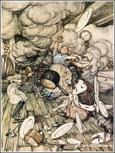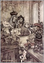 Alice finds the Hare and Hatter having tea together under a tree in front of the hatter’s house, with the childlike Hare, similar to the White Rabbit, and the Mad Hatter, who is insane in spite of his formal head covering. Mad tea parties were held in insane asylums so that inmates could learn to behave in the world, and just as with little girls the tea party is an empty formality, with empty cups and no tea. The Cheshire Cat was right, as either way Alice went she would have ended up at the same insane party. The two resemble Alice and her sister, the White Rabbit and Queen of Hearts, and the White and Red Queens of the Looking Glass, with the heart and mind, child and adult, opposed to each other and Alice alike. Both rest their elbows on the sleeping Dormouse’s head, on either sides of the dream, like the Queens on both sides of Alice in the end of the second story.