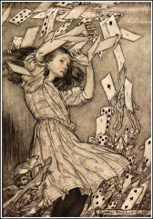 Alice meets playing cards who are painting white roses red. The other cards process in with the White Rabbit nervously smiling at everyone inclusively. The painting cards fall on their faces, and the Queen asks Alice who she is and who the cards are. As the cards are face down, and the Queen’s cards, not Alice’s, she tells the Queen that they are none of her business, as if she wouldn’t look at someone else’s hand, or servant, face down. The Queen screams, OFF WITH HER HEAD!, and Alice says this is Nonsense. Alice is dreaming, so her head is already off somewhere else, but also here in the garden. The King of Hearts timidly, like the White Rabbit, suggests Alice is only a child, so the Queen quietly moves to consider her cards. It is said that Mrs. Liddell was the one with the power, with Dean Liddell meekly following suit. Carroll’s work is full of bossy women who get their way, including Alice.