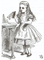 Alice falls into a hall with a three-legged glass table, much like a three-pronged Aristotelian syllogism, an invisible form that is also transparent. On the table is a golden key, like a perfect answer, and after searching the room and many locked doors twice-round Alice finds a small door to the loveliest garden that the key unlocks but Alice is too large to get through. She hopes to find something that can shrink her, and she does on the table next to the key that wasn’t there before that says Drink me. Alice checks the bottle to see if it reads Poison, as she’s read several stories with clear morals about children who drink bottles marked Poison, even though she’s a bit dense if she thinks it could be marked both Drink me and Poison and we could trust the labels or whomever wrote them.