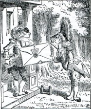 Alice grows very tall and upsets the Pigeon who is guarding her nest and accuses her of being some kind of serpent after learning that Alice eats eggs. Alice can move her long neck like a serpent, or a caterpillar, and she defies the Pigeon’s syllogistic reasoning, which is valid but false. Alice shrinks down to the right size and finds the house of the Duchess, who is an abusive mother beating her baby, unlike the protective Pigeon saving her eggs from Alice. The Fish and Frog Footmen, the Fish from the large sea of the Queen and the Frog from the small pond of the Duchess, get their formal wigs tangled together as the Fish gives the Frog the Duchess’ invitation to play a game of croquet together. The Frog tells Alice he can’t let her into the Duchess’ house as he is on the same side as her and they can’t hear her inside, as both are lowly, Alice now smaller.
